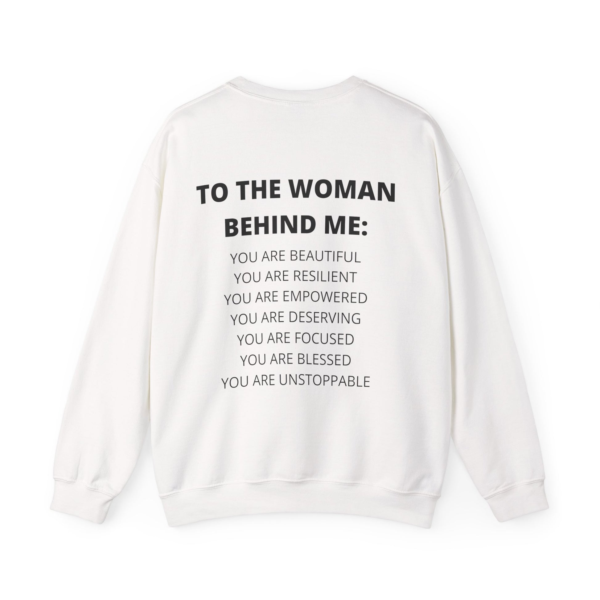 To The Woman Behind Me you are beautiful, resilient, empowered, deserving, focused, blessed, UNSTOPPABLE! This is a powerful statement sweatshirt that will uplift and inspire every woman that you encounter on your journey